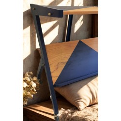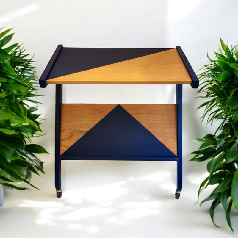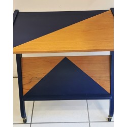 Jolie desserte bleu et bois sur roulette. Une servante au design vintage parfaitement restaurée et refaite au goût du jour.